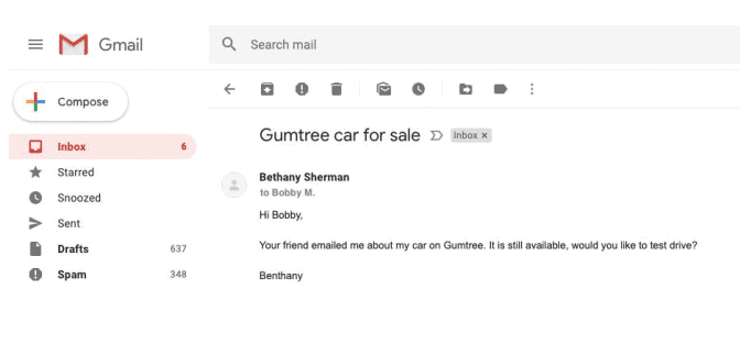Using a different identity, the scammer contacts Bethany about a car she is selling on Gumtree. Scammer moves contact to private email to reduce the risk of disruption of Gumtree administrators.