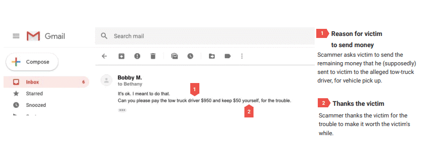 He overpays and asks Bethany to pay his tow truck driver. After receiving a FAKE PayPal confirmation, Bethany transfers money from her bank account to the “truck driver.” That money is her OWN money because she received nothing from the scammer. The truck driver’s bank account is Brian’s bank account, obtained through the romance scam.