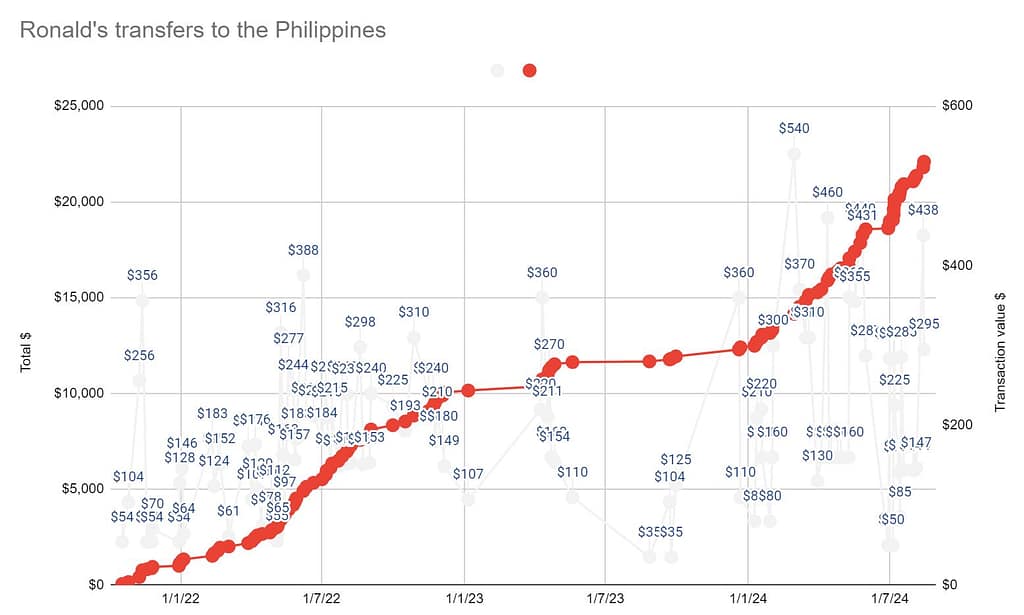 While each individual transaction might have seemed insignificant to Ronald, the cumulative effect was staggering. Over 97 transactions, Ronald sent a total of $22,900 to Mary. To put this in perspective, this amount is roughly 1.4 times the average annual wage in the Philippines, yet there was no apparent improvement in Mary’s living conditions. She continued to portray herself as living in poverty, constantly facing new emergencies that required Ronald’s financial assistance.